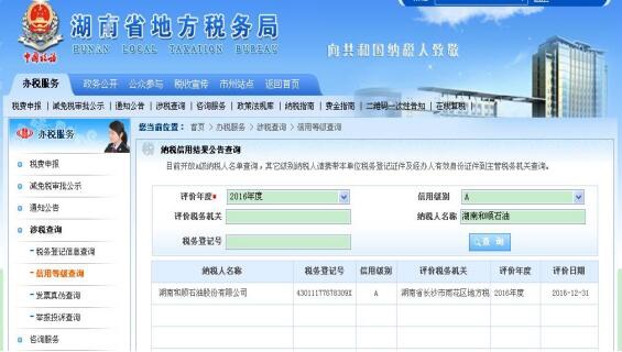 为推进社会诚信体系建设,湖南省国税局、地税局按照国家税务总局《纳税信用管理办法(试行)》(总局公告2014第40号),开展了2016年度纳税信用联合评价工作,我司再次获得纳税信用“金字代言——A级纳税人”的称号,我司已连续三年获此荣誉,展现了诚信纳税的良好企业形象。